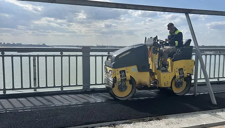 Възстановяването на затворения за основен ремонт 320-метров участък на "Дунав мост" при Русе напредва, като екипите вече върнаха на мястото му реставрирания пешеходен парапет. В платното за България, където в момента е съсредоточена техниката, работниците полагат пясъчен асфалтобетон и изграждат новия отводнителен колектор.