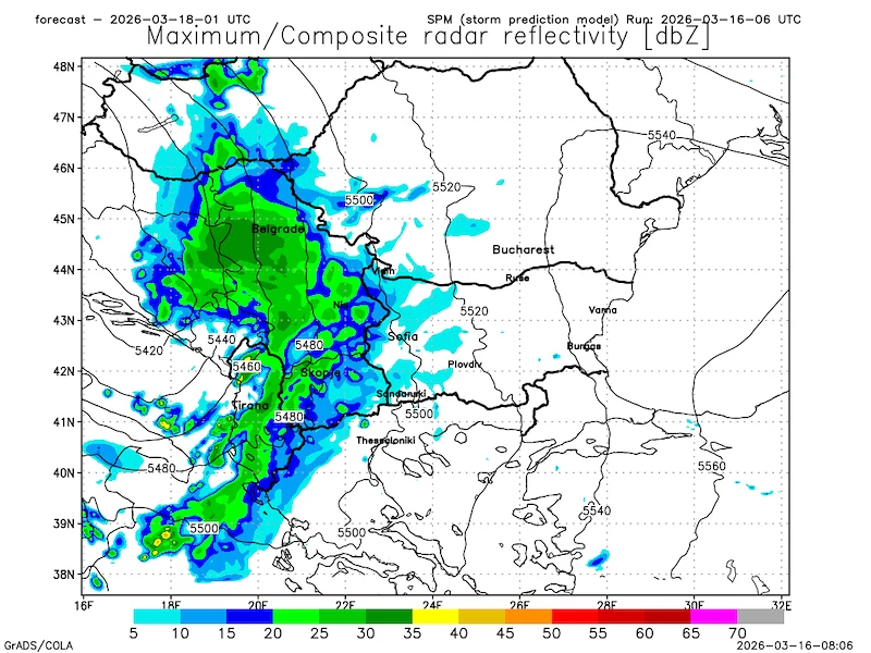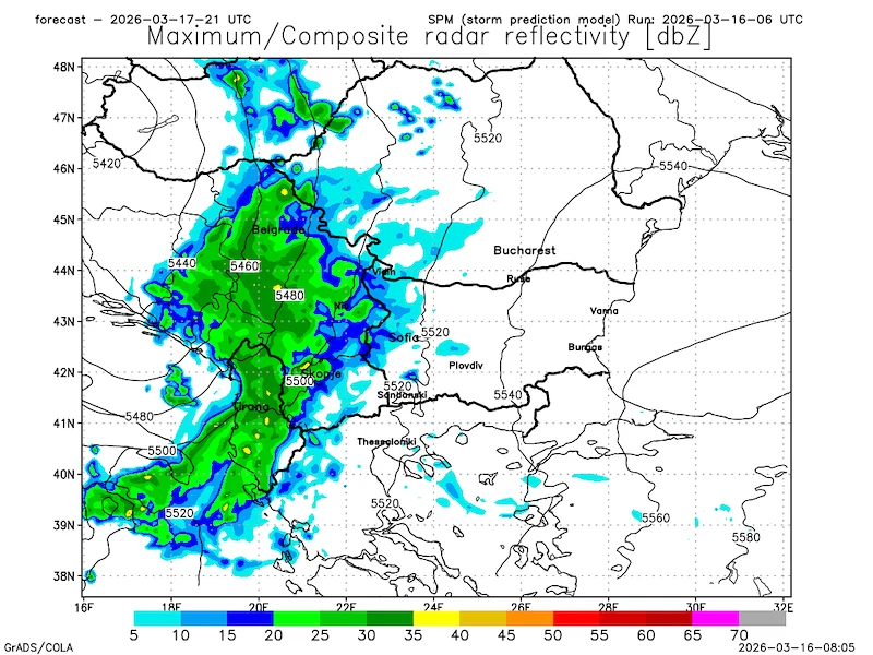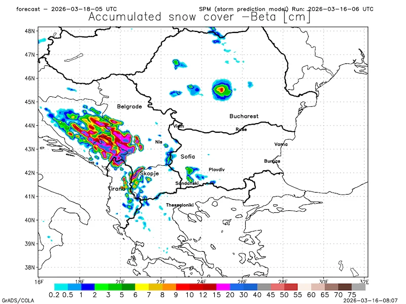 Данните от специализираните модели SPM и ALADIN показват, че времето на Балканите ще остане изключително динамично през следващите дни. Студеният атмосферен фронт ще продължи да генерира обилни снеговалежи във високите части и сериозни количества дъжд в равнините, като температурите трайно ще се понижат.