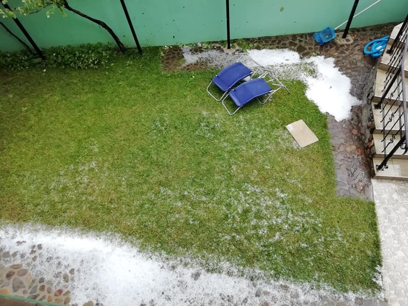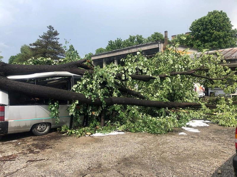 Любителски кадри показват дърво, паднало върху бус в града, както и градини, които са буквално побелели от ледените парчета. По първоначална информация, пострадали няма. Щетите обаче вероятно са значителни.