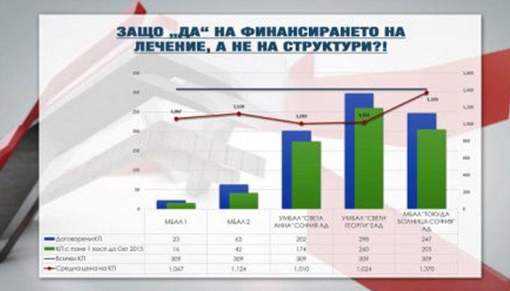 На третата показана от него графика са представени пет болници и съответният брой договорени клинични пътеки и пациенти, приети по тези клинични пътеки.