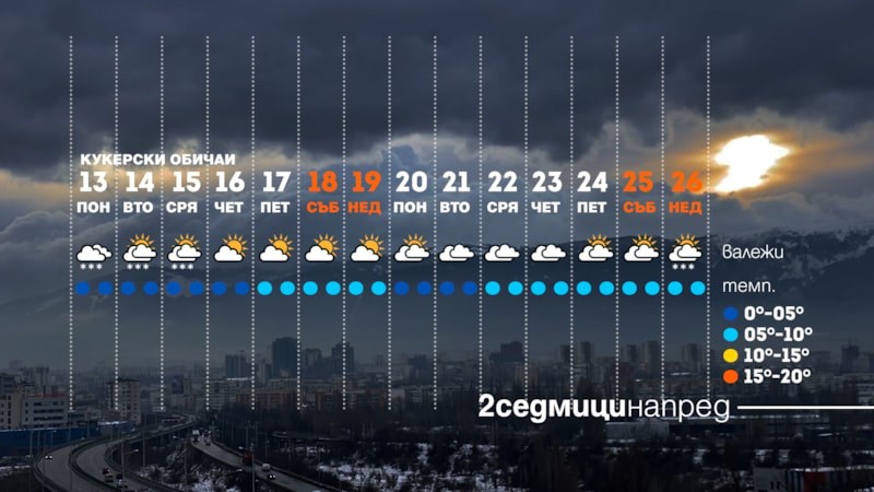 От четвъртък времето ще се подобри значително, като се очакват повече слънчеви часове. Сутрините обаче ще бъдат мъгливи, с намалена видимост в някои райони. През седмицата температурите ще останат в рамките на зимните норми. Най-ниските стойности ще бъдат в сряда и четвъртък, когато сутрешните температури ще достигат до минус 8 – минус 9 градуса. Най-студено ще бъде в районите с малко облачност и без вятър. Дневните температури ще се задържат в диапазона от 0 до 5 градуса, като към края на седмицата ще достигат между 3 и 8 градуса.