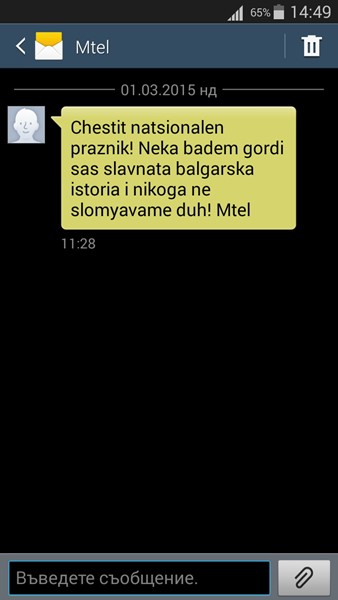 Въпреки че днес не е 3, а 1 март - празник на Баба Марта, текстът на съобщението с което "Мтел" иска да напомни за себе си, не отговаря на традиционните пожелания за днешния ден. Въпреки че от текста на става ясно кой точно национален празник се честити, изречението: