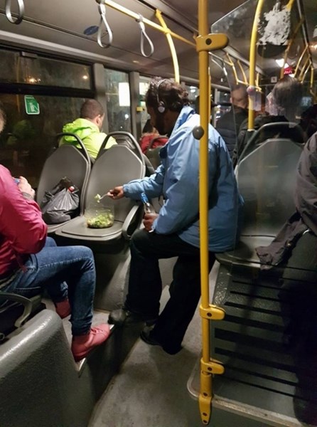 Дотук добре. Скандалното обаче е, че човекът е заел цели три места в рейса. На едното се е разположил той, на другото е сложил кутийката със салатата, а на третата – пазарската си торбичка.