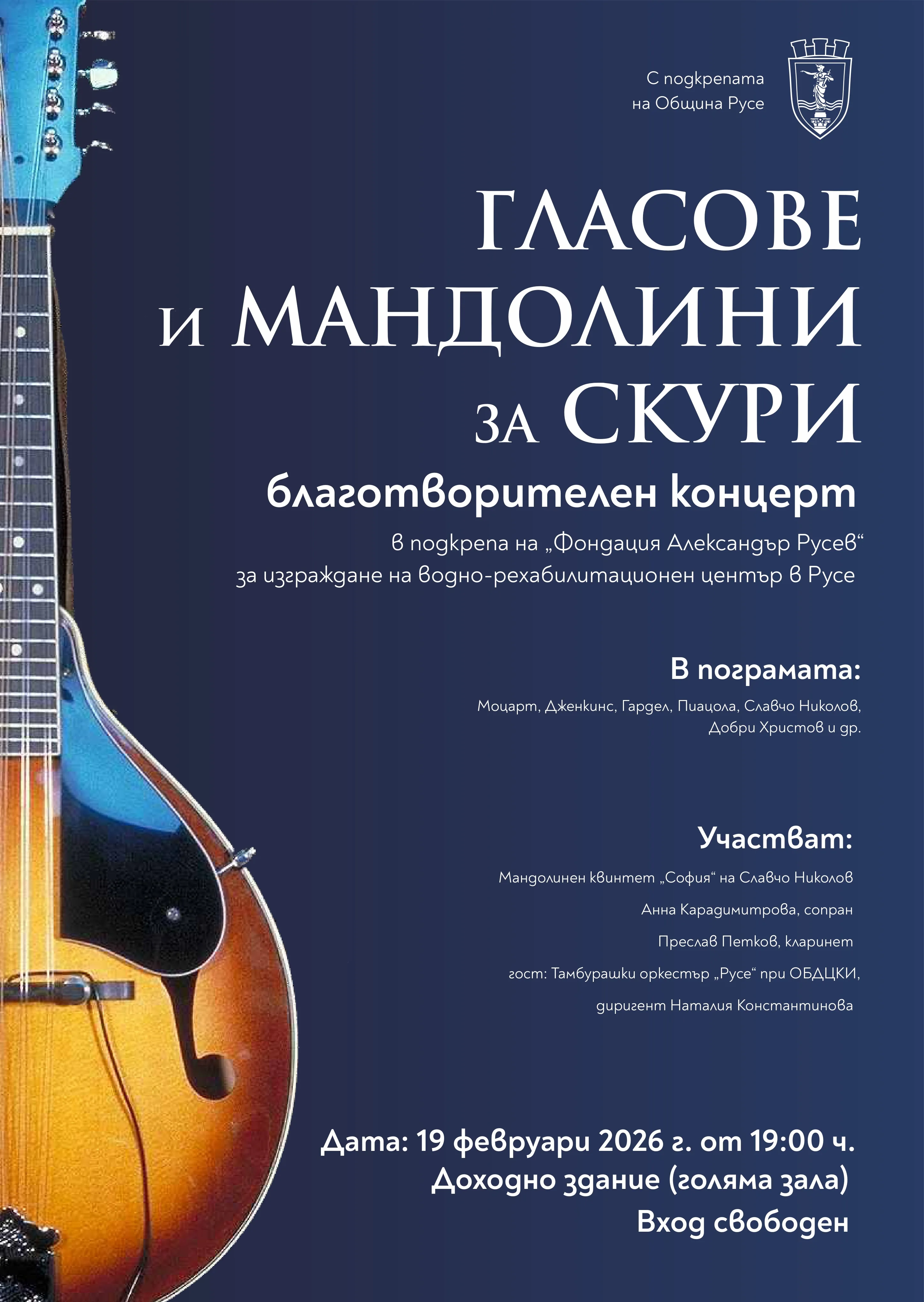 Русенската общественост отново ще има възможност да покаже своята съпричастност и единство в името на една от най-значимите местни каузи. На 19 февруари (четвъртък) от 19:00 часа Голямата зала на Доходното здание ще бъде домакин на благотворителния концерт „Гласове и мандолини за Скури“. Събитието е посветено на изграждането на дългоочаквания водно-рехабилитационен център за деца и възрастни с ментални и физически затруднения – мисията на живота на Илиян Русев – Скури и неговата фондация „Александър Русев“.