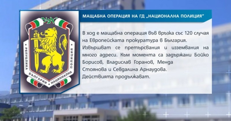 По-рано от МВР съобщиха, че е в ход мащабна операция във връзка със 120 случая на Европейската прокуратура в България, Извършват се претърсвания и изземвания на много адреси. От МВР съобщиха още, че са задържани Бойко Борисов, Владислав Горанов, Менда Стоянова и Севдалина Арнаудова.