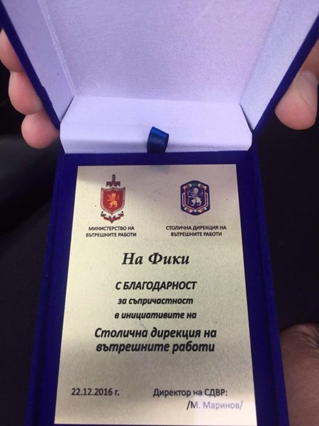Директорът на СДВР Младен Маринов е наградил чалга звездата Фики с плакет с потресаващ надпис: „На Фики с благодарност за съпричастност в инициативите на Столична вътрешна дирекция на вътрешните работи“.