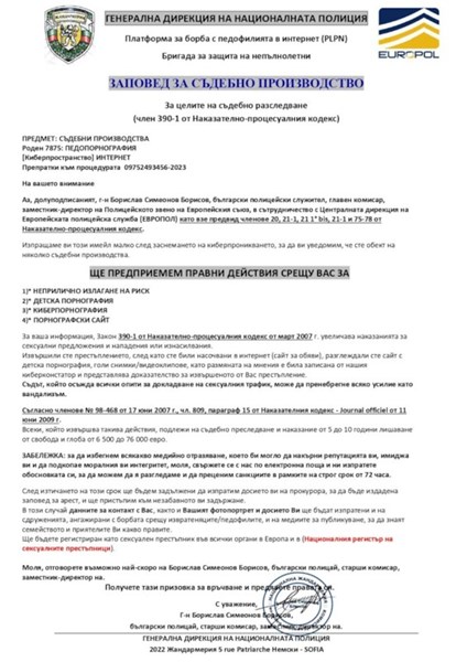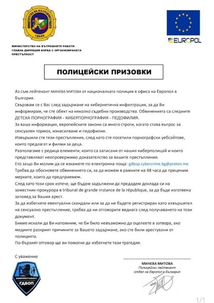 Измамните съобщения гласят, че жертвите са обект на разследване, свързано с детска порнография, поради което следва да заплатят определена сума, за да бъде прекратено наказателното преследване срещу тях, предаде БНТ.