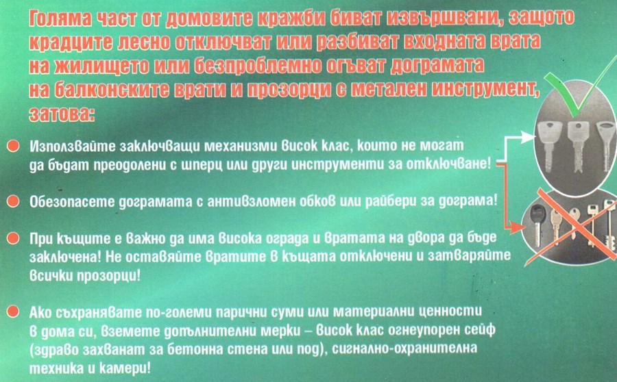 Полицията съветва гражданите да бъдат особено внимателни и да следват предложените мерки за защита на своите домове. Въпреки значителните разходи, свързани с тези мерки, те се считат за необходими за гарантиране на сигурността и опазване на имуществото.