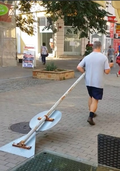 Видеоклип, показващ как мъж влачи метална тръба с поставени на нея два пътни знака през централната ул. Александровска в Русе, бе публикуван и разпространяван в интернет.