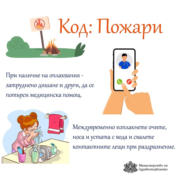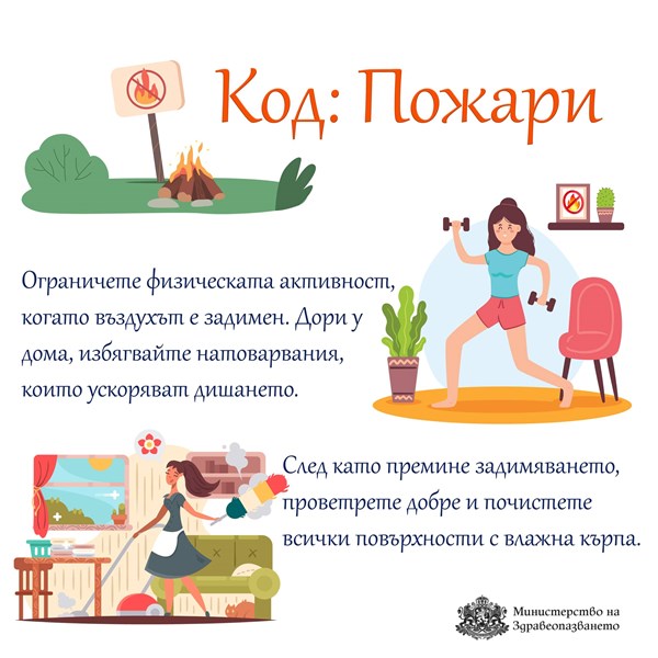 "Ако в района ви има активен пожар, задимяване или задушлива миризма, се придържайте към посочените съвети", призовава МЗ в публикация във Facebook страницата си.