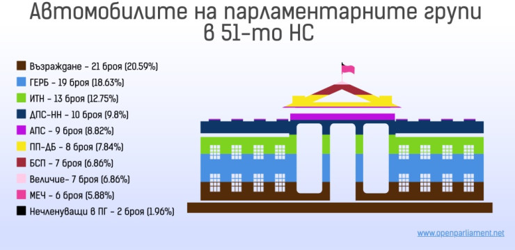 Разпределението по парламентарни групи показва, че най-много депутати с декларирани превозни средства има във "Възраждане" - 21 души. Следват ГЕРБ-СДС с 19 представители, "Има такъв народ" с 13 и "ДПС-Ново начало" с 10 народни представители.