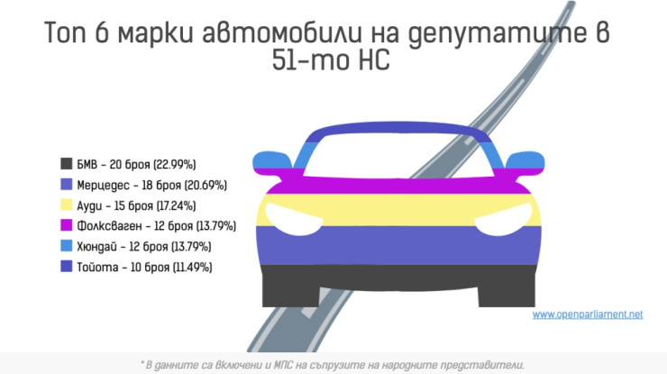 Предпочитаните марки на депутатите са BMW с 20 декларирани автомобила, Mercedes с 18 и Audi с 15. В топ 6 влизат още Volkswagen и Hyundai с по 12 автомобила и Toyota с 10.