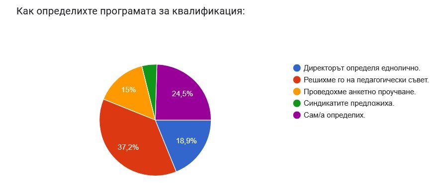 Изследването показва, че 68,5% от педагогическите специалисти са се обучавали със средства за квалификация, заложени в училищния бюджет, договорени благодарение на синдикатите. Въпреки това, 33,3% от учителите и директорите са се квалифицирали със собствени средства.