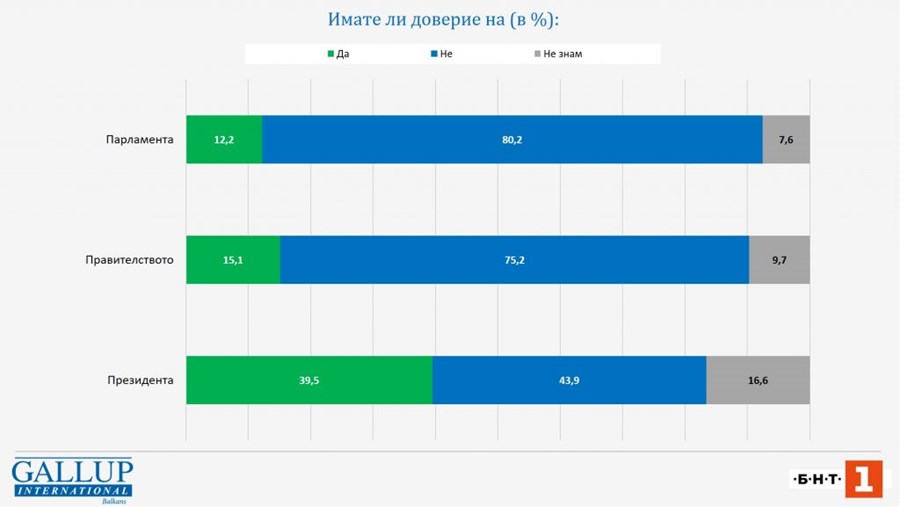Сред трите основни институции на политическото представителство и власт у нас с най-високо одобрение е президентската: с 39,5% доверие, при 43,9% недоверие. Доверието в правителството е 15,1%, а недоверието – 75,2%, а парламентът е с 12,2% доверие, при 80,2% недоверие.