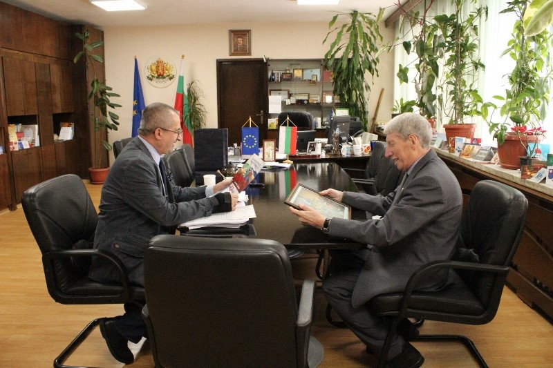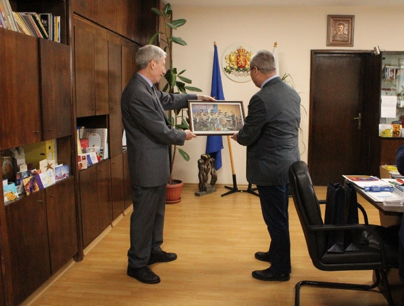 Доц. д-р Бурджиев сподели, че е голям ценител на класическото изкуство и на фотография. Евгени Станимиров благодари за доброто отношение, което винаги е получавал от областния управител и му подари своя фотография, изобразяваща момент от концерт на Русенската филхармония по време на Мартенските музикални дни от 2015 г.