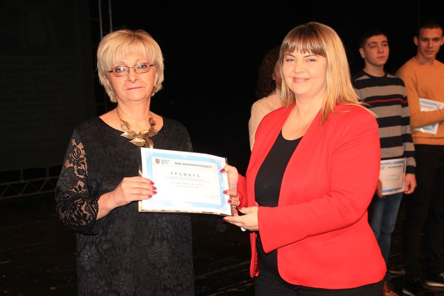 Учителите, които си поделиха премията на фонд „Математика на бъдещето” са Ася Кулева, старши учител по немски език – за постижения в създаването и популяризирането на педагогически опит, популяризиране на гимназията и литературно творчество и Диана Йорданова, старши учител по физика и астрономия – за значими постижения на нейните възпитаници по физика и по химия.