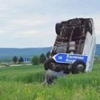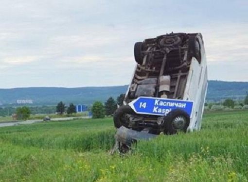 Микробус "Мерцедес Спринтер" излезе от пътя край шуменското село Мадара, отнесе указателна табела и се заби вертикално в нива, а шофьорът и пътниците останаха невредими.