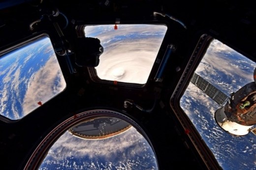 Снимки, направени от астронавтите Джак Фишър и Ранди Бресник от борда на Международната космическа станция показват супер тайфуна в действие.