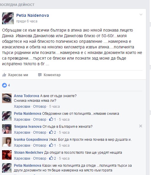„Намерена е извън Атина на около 10 километра. Мъртва, изнасилена и чисто гола. С нея е имала някакви документи, но не преведени. Били са на български и полицията дето я намери, един от полицаите е близък приятел на майка ми и баща ми и се обади да попита дали я познаваме и дали ще можем да преведем документи“, сподели Петя Найденова, цитирана от Българските новини в чужбина.