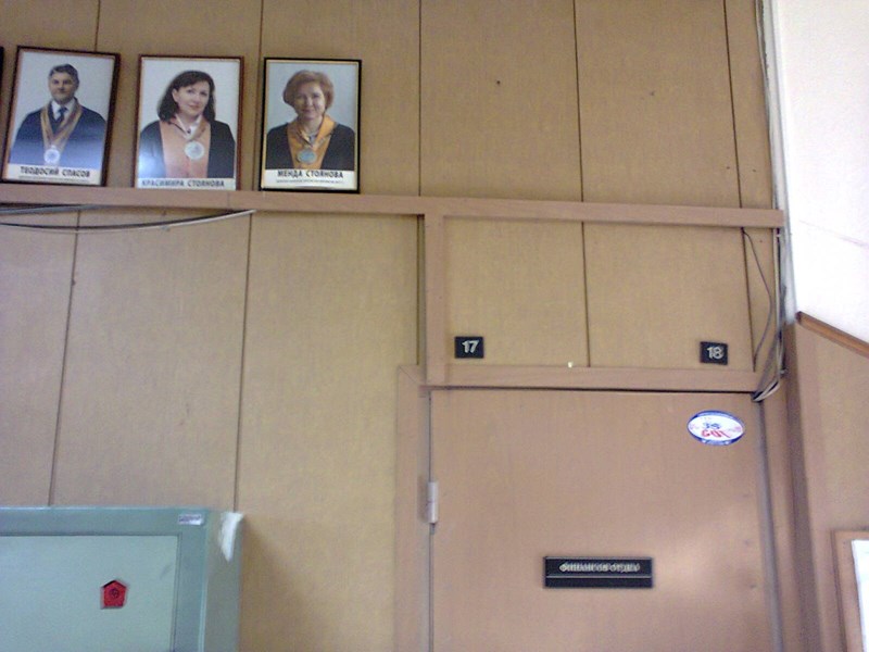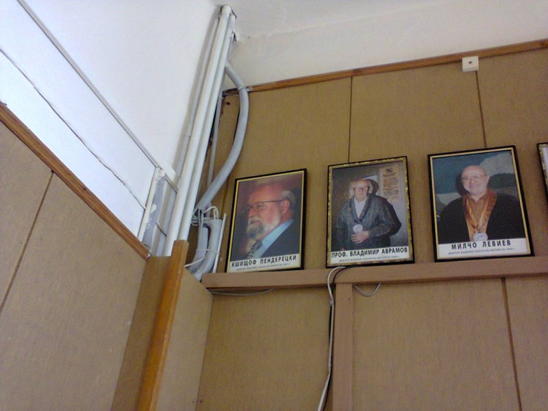 На първата снимка се вижда Менда Стоянова редом до оперната прима Красимира Стоянова (!), а на втората - първият почетен доктор на Пловдивската академия големият композитор Кшищоф Пендерецки е просто натикан в ъгъла до кабелите и тръбите... Как Ви се струва в една академия по изкуствата?