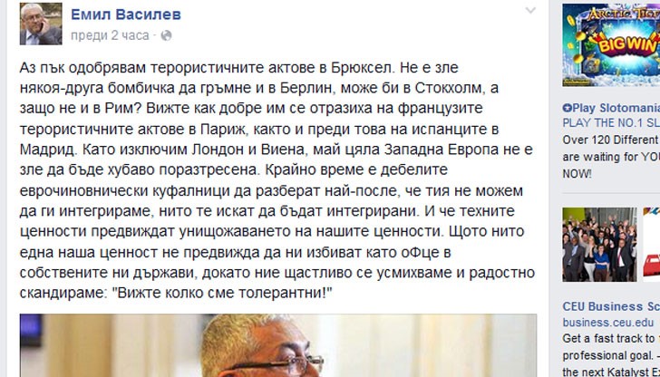 Аз пък одобрявам терористичните актове в Брюксел, пише на страницата си във Фейсбук депутатът Емил Василев.