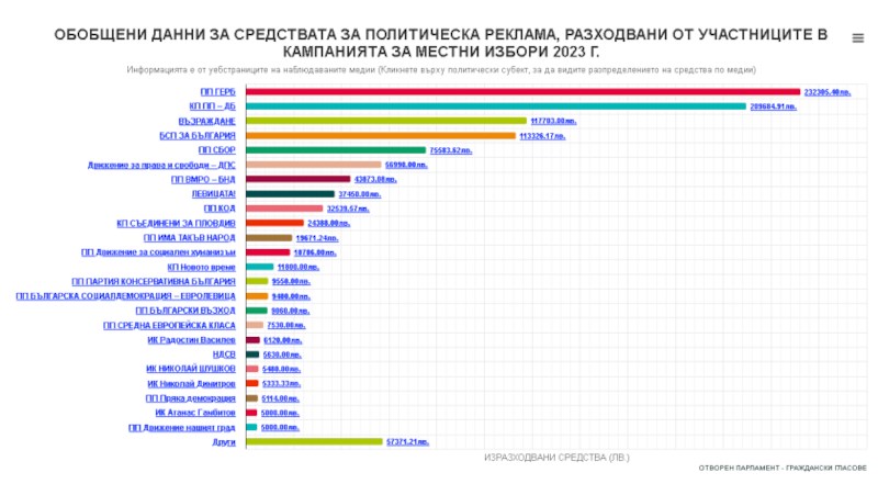 Първото място по разходи заема ГЕРБ с 232 305 лв. без ДДС. За първите десет дни на кампанията партията на Бойко Борисов беше похарчила 220 005 лв., тоест, няма съществено увеличение. Не такъв е случаят на коалицията ПП-ДБ, чиито разходи са скочили от 93 630 лв. за първата десетдневка на 209 685 лв. сега. Третото и четвъртото място заемат, както преди, „Възраждане“ (117 703 лв.) и БСП (113 326 лв.). На тези четири формации се падат отново 60 процента от всички рекламни разходи досега, които общо възлизат на 1 130 720 лв. без ДДС в първите 20 дни на кампанията.