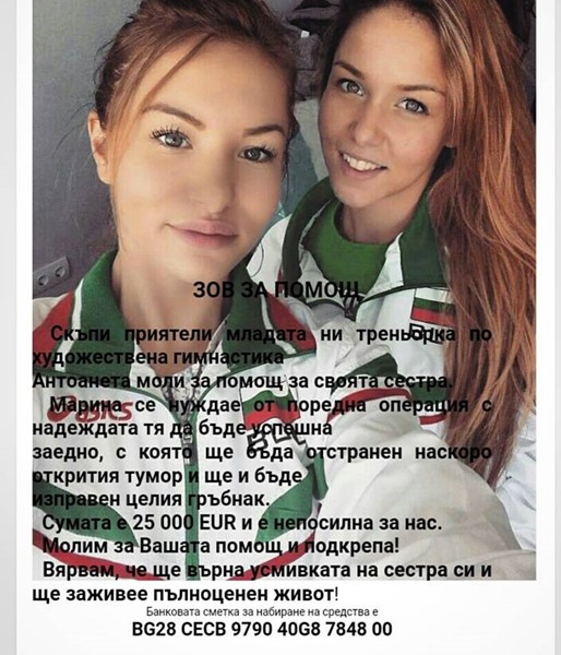 Треньорката в клуба по художествена гимнастика на ЦСКА Антоанета Вълкова съобщи, че необходимите 25 хиляди евро за лечението на сестра й Марина са непосилни за семейството. 22-годишното момиче се бори от години с коварна болест.