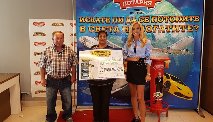 Нели Христова от град Стара Загора е щастливката, в чиито ръце падна джакпотът от 3 000 000 лева в играта „ГОЛЕМИЯТ ДЖАКПОТ“.
