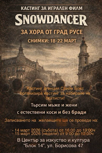 Жителите на Русе имат възможност да станат част от международна кинопродукция, след като специализирана агенция обяви кастинг за статисти за предстоящ немски игрален филм. Снимките ще се реализират изцяло на територията на крайдунавския град през втората половина на месец март 2026 година.