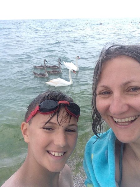 Няколко двойки от грациозните пернати доплаваха до брега за радост на летуващите.