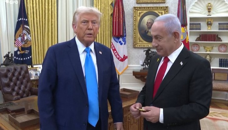 Израелският премиер Бенямин Нетаняху изненада с необичаен жест американския президент Доналд Тръмп по време на посещението си във Вашингтон. Според информация на БНТ, израелският лидер е връчил на Тръмп златен пейджър, монтиран върху дървена стойка.