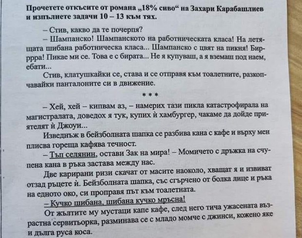 Нецензурни думи в учебно издание за 10-и клас - за това сигнализират родители в социалните мрежи, предава Агенция Фокус. Нецензурните изрази правят впечатление на Петя Павлова в учебното помагало на сина ѝ. Тя веднага подава сигнал.