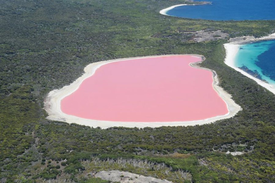 От птичи поглед езерото Хилиър изглежда ярко, бонбонено розово. Погледнато от брега обаче то е по-скоро прозрачно, нежнорозово. Бреговете му са покрити със солни наноси, изхвърлени от изключително солените води на уникалния природен феномен.