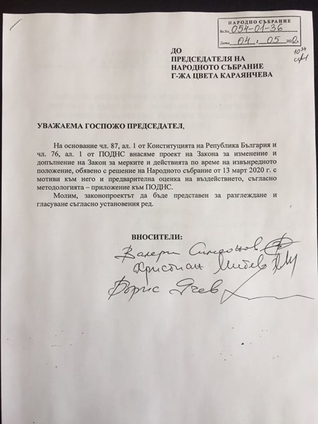 Валери Симеонов и народни представители от НФСБ внесоха тази сутрин в деловодството на Народното събрание проектозакон, с който удължават срока за строителство по Черноморието.