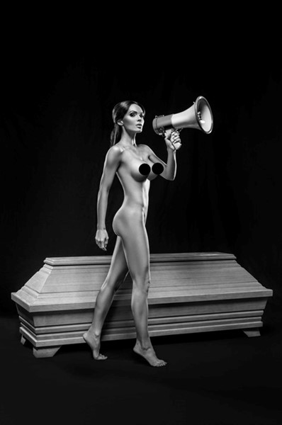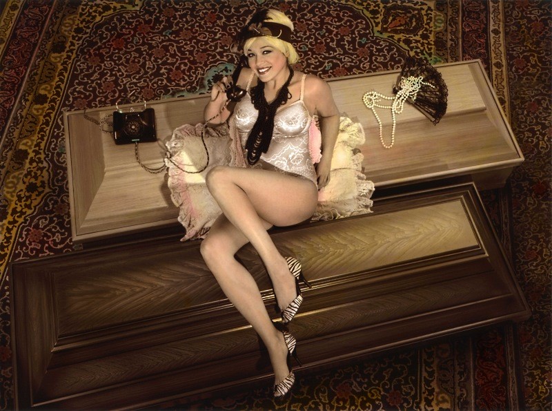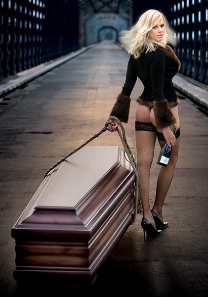 Ами защото знойни хубавелки в оскъдни дрешки, а някои от тях чисто голи, аранжирани с цветя, рекламират ... ковчези!