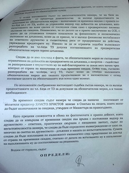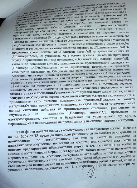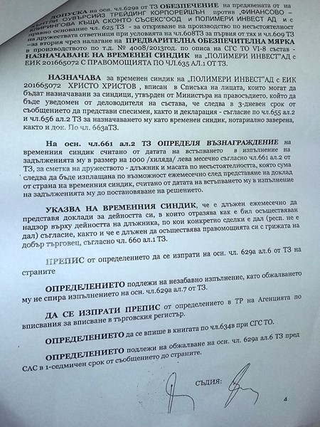 С определение 1450 от 11.03.2014 г. Ченалова приема, че има доказателства за кредити от 40 млн. евро отпуснати от ХЪНТЛИ на „Полимери Инвест”, за които „Финансово-клирингова къща Сконто Съсекс” издала запис за заповед. Тя налага обезпечителна мярка на „Полимери Инвест” и назначава за временен синдик Христо Христов.