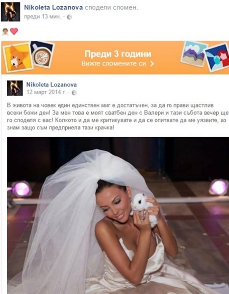 "В живота на човек един единствен миг е достатъчен, за да го прави щастлив всеки божи ден! За мен това е моят сватбен ден с Валери и тази събота вечер ще го споделя с вас! Колкото и да ме критикувате и да се опитвате да ме уязвите, аз знам защо съм предприела тази крачка!"
