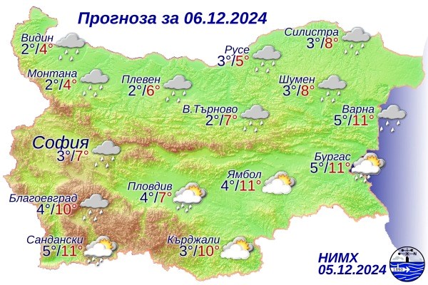 Националният институт по метеорология и хидрология прогнозира за петък, 06 декември 2024 година, задържане на значителна облачност над страната. През нощта се очакват дъждове в северозападните райони на България, а сутринта ще има намалена видимост в равнинните части и низините.