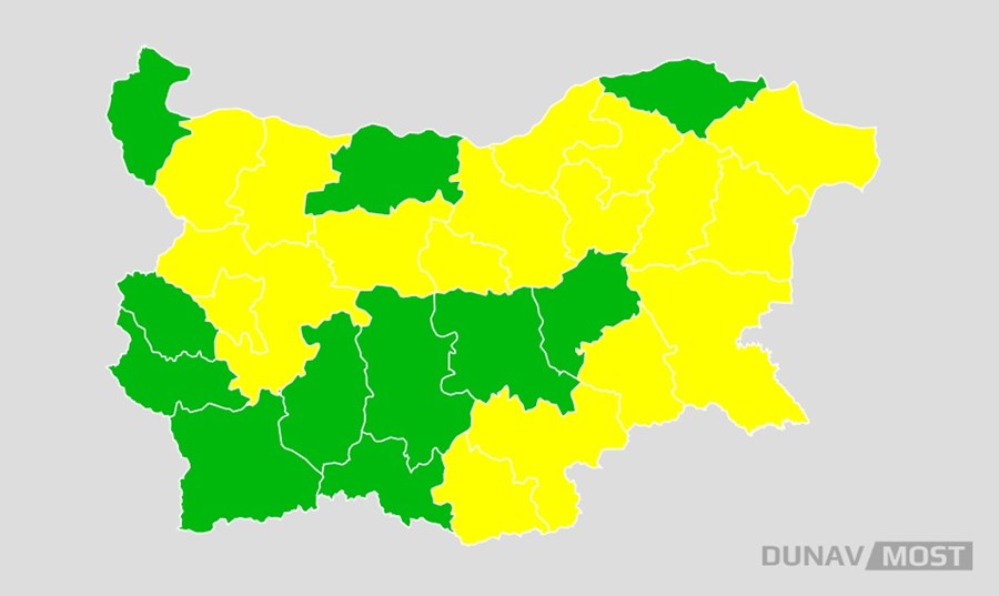 Жълт код за потенциално опасно време и силен вятър е обявен в половин България, съобщиха от НИМХ. Предупреждението е в сила за областите: Русе, Добрич, Варна, Бургас, Ямбол, Хасково, Кърджали, Шумен, Разград, Търговище, Велико Търново, Габрово, Ловеч, Враца, Монтана, София област и София град.