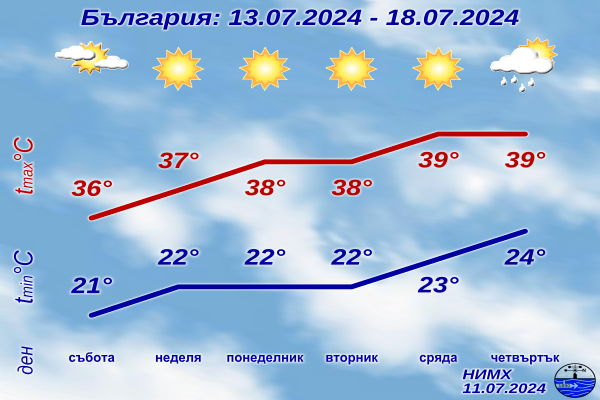 През почивните дни и до средата на новата седмица се очаква слънчево и много горещо време, предупреждава Националният институт по метеорология и хидрология към БАН. В събота ще има временни увеличения на облачността над източните райони, като на отделни места са възможни и краткотрайни валежи. Прогнозата сочи, че времето ще бъде почти тихо или със слаб вятър от изток-североизток.
