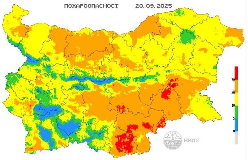 Според картата на НИМХ степента на пожароопасност в цялата страна остава висока, като обширните равнинни и предпланински райони са най-уязвими към бързо разпалване на огън.