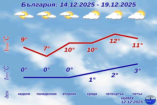Ситуацията ще се промени в неделя, 14 декември, когато вятърът от северозапад ще се усили до умерен. Това ще помогне за разчистването на мъглите на повечето места в страната. Сутринта обаче ще бъде студена с минимални температури между минус 5 и 0 градуса, докато в югоизточните райони термометрите ще показват до 2-3 градуса. Максималните температури през деня ще достигнат интервала между 7 и 12 градуса.