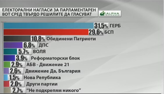Ето и електроралните нагласи сред твърдо решилите да гласуват: ГЕРБ – 31,5%, БСП – 29,6%, ДПС – 6,8%, Обединени патриоти – 10,8%, "Воля" – 5,7%, Реформаторски блок – 3,9%, "АБВ – Движение 21" – 2,9%, "Движение Да, България" – 2,6%, "Нова република" – 1,5%, Други партии – 2%, "Не подкрепям никого" – 2,7%.