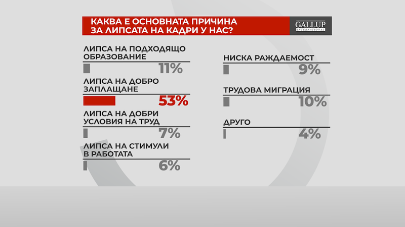 Недостатъчното заплащане е основната причина за липсата на кадри в България, показа анкета в предаването "Референдум" по БНТ, излъчено тази вечер. Повече от половината участници в допитването - 53%, посочиха ниските възнаграждения като водещ фактор за кадровия дефицит.