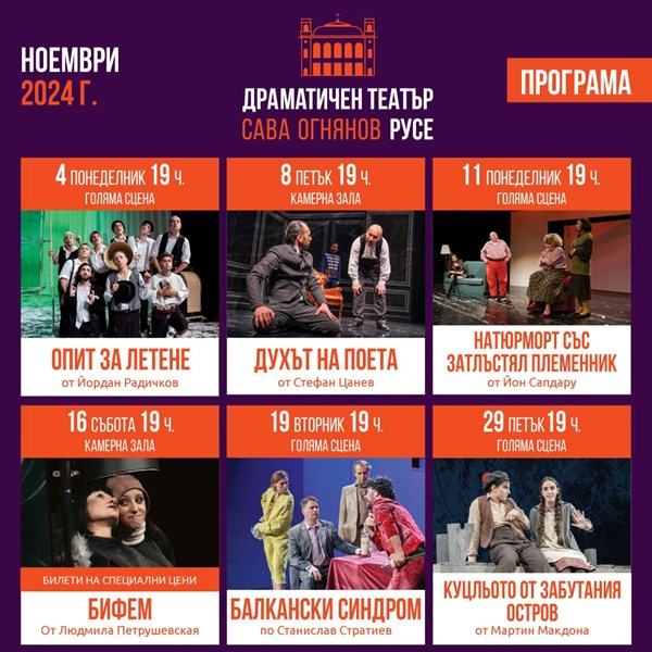 Драматичен театър "Сава Огнянов" - Русе започва месец ноември с богата програма от представления. На 4 ноември от 19:00 часа на Голяма сцена ще бъде представен спектакълът "Опит за летене" по Йордан Радичков. Режисьорът Недялко Делчев споделя: "Цялата тази история, която тук ще види публиката е като едно съновидение на един човек, който вижда своите ученици. Всичко става в едно малко селце някъде в Балкана и всички познават попа, даскала и кмета, но най-вече даскала, който ги е създал като хора." В постановката участва гост-актьорът Алексей Кожухаров.