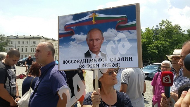 Те скандират „Тук не е Москва“ и носят плакати „Путин - фашист, световен терорист“. Антируските демонстранти, които са около 50 души, влязоха в сблъсъци с полицията. Те започнаха да скандират искания за оставката на премиера Бойко Борисов и вътрешния министър Румяна Бъчварова, защото, според тях, те са превърнали „България в руска губерния“.