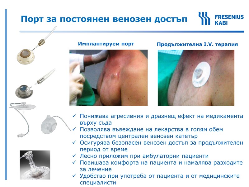 Става дума за т.нар. "порт за постоянен венозен достъп". Чрез местна упойка той се имплантира в централен кръвоносен съд в областта между шията и сърцето. Така през него могат да се вливат лекарства в голям обем.