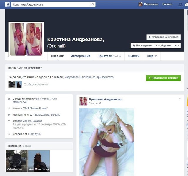 Приятелката й Кристина се появява с два профила /или поне толкова открихме/ - като в единия се представя за Кристина, а в другия за Мариела Андреанова. Профилите са с идентични снимки. От тях става ясно, че момичето е от Стара Загора, на 21 -години, а идолът й е Асен Блатечки. На една от снимките тя дори позира с него.