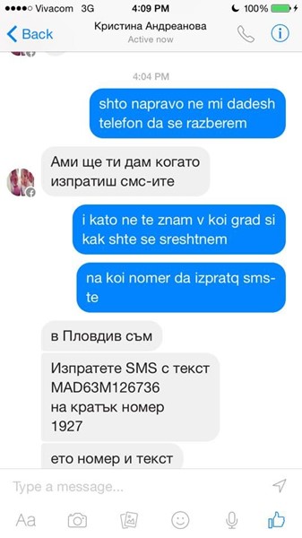 „Тези измами стават все по-разпространени, а фейсбук е идеалния капан за наивници. Изпращаш смс-ите, след това момичето ти блокира профила и си прибира парите от мобилния оператор, с когото си е сключила договор. Ти няма да тръгнеш да се жалваш в полицията, че някаква пикла те излъгала и ти е взела 12 лева. Така че момичето си е на чиста печалба", твърдят източници на TrafficNews.bg.