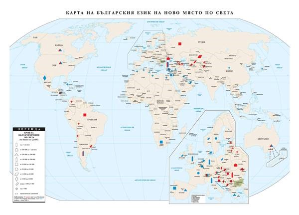 „Картата на българския език на ново място по света” доста отчетливо отразява противопоставянето на Източна Европа (заедно с вторичните „вътрешни” преселвания в Средна Азия) – със стари заселници (вж. фигурите с червен цвят) на Западна Европа – с нови заселници (вж. фигурите със син цвят). Новият свят (двете Америки и Австралия) заема средищно положение.